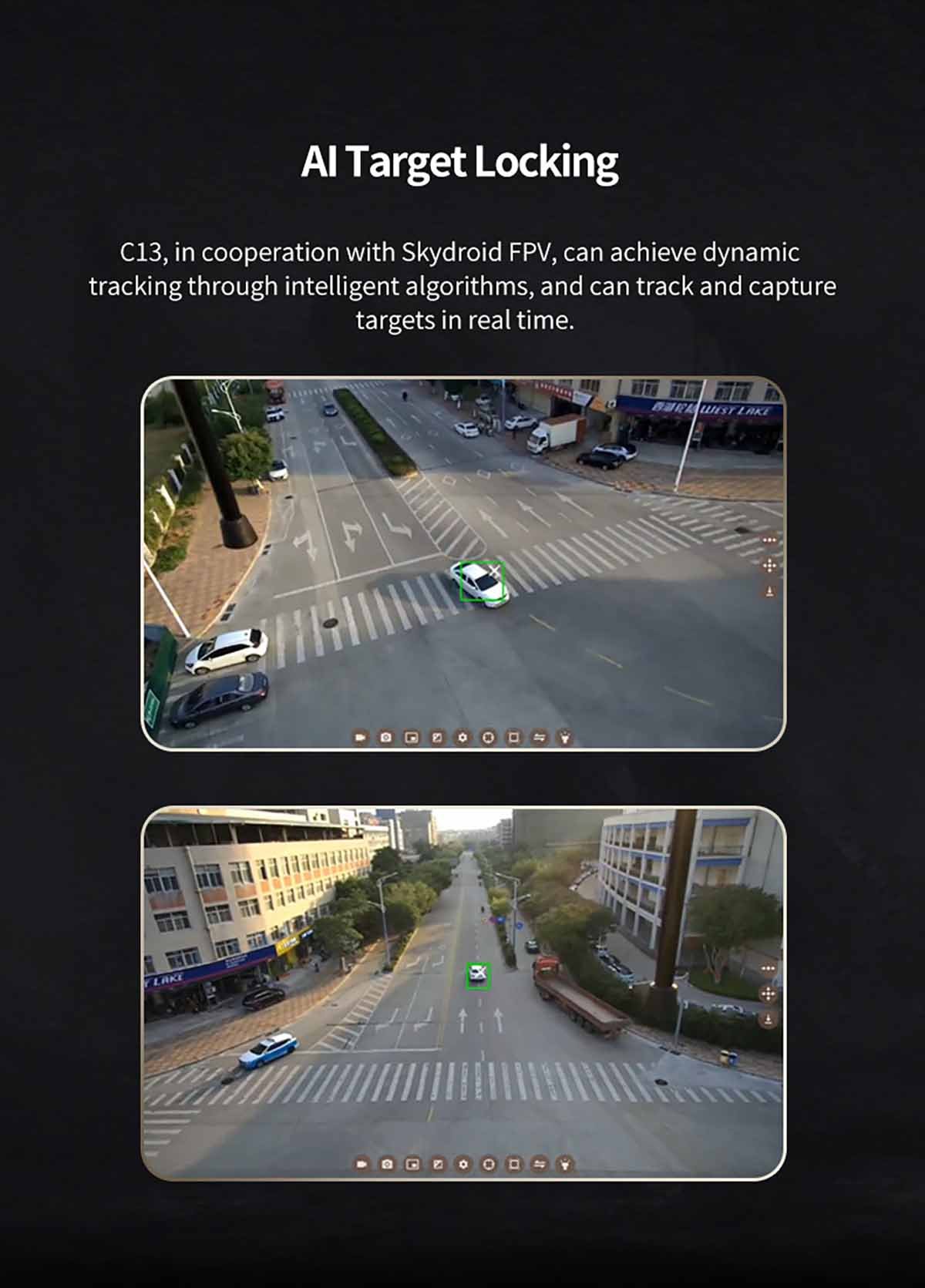 C13, in cooperation with Skydroid FPV, can achieve dynamic tracking through intelligent algorithms, and can track and capture targets in real time.
