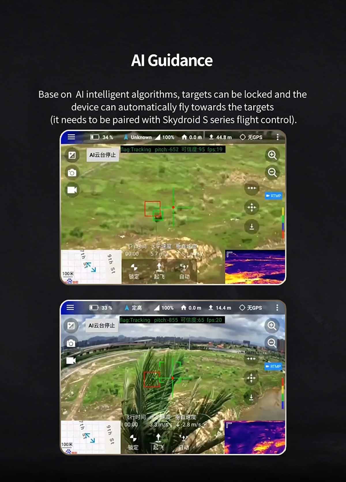 Base on AI intelligent algorithms, targets can be locked and the device can automatically fly towards the targets (it needs to be paired with Skydroid S series flight control)
