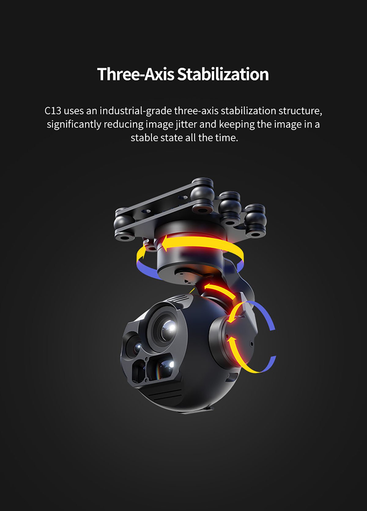 C13 uses an industrial-grade three-axis stabilization structure, significantly reducing image jitter and keeping the image in a stable state all the time.