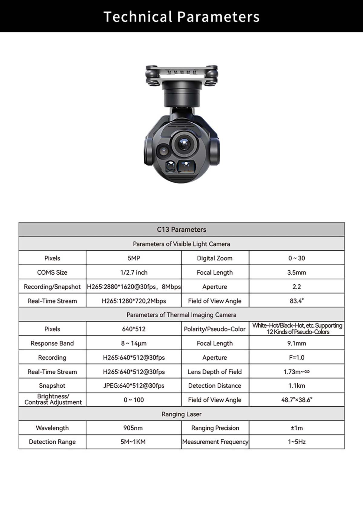 Skydroid C13 is a three-axis gimbal that integrates a 500W-pixel visible light camera, a 640 thermal imaging sensor, and a laser rangefinder.