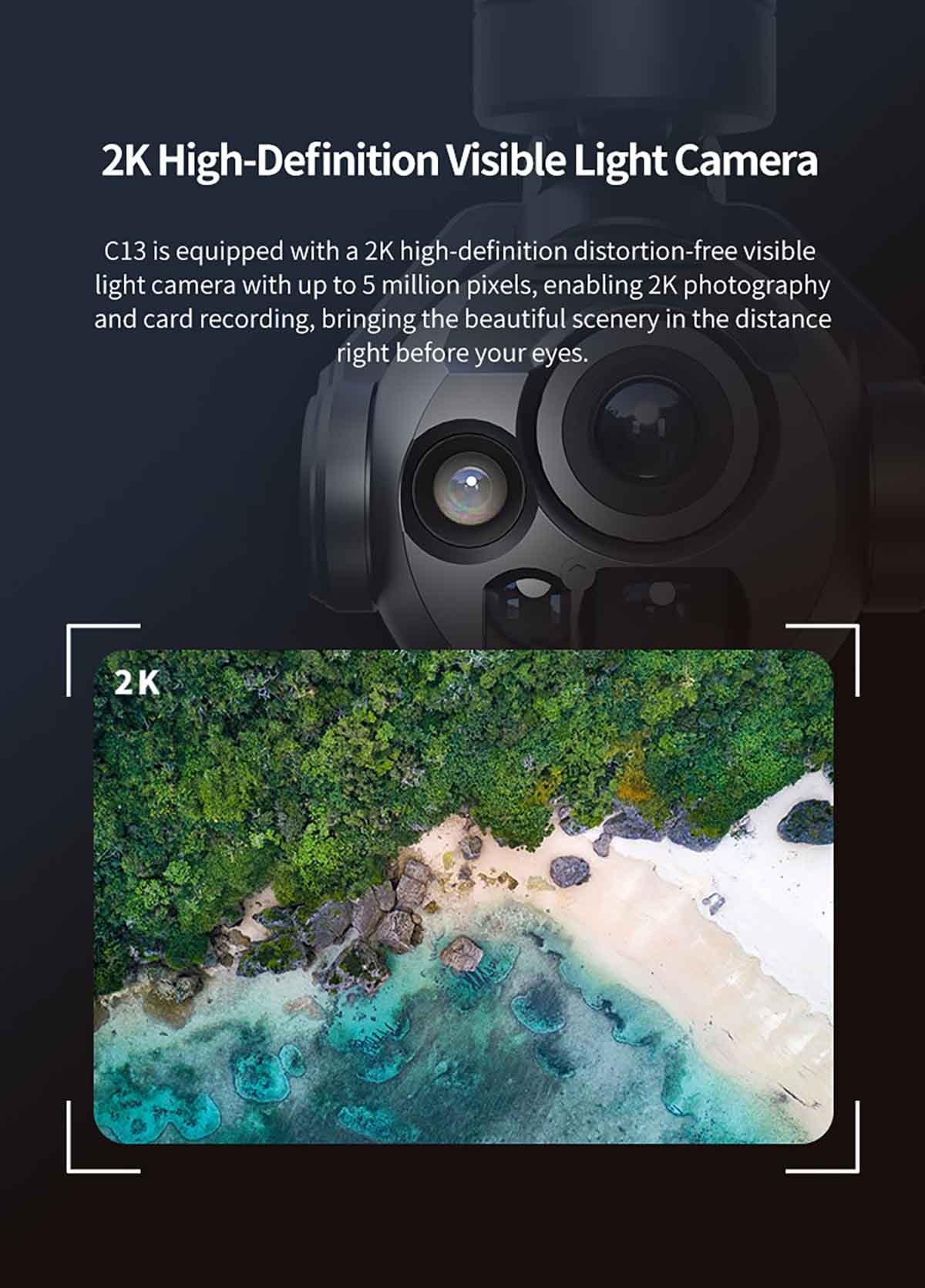Skydroid C13 is equipped with a 2K high-definition distortion-free visible light camera with up to 5 million pixels, enabling 2K photography and card recording, bringing the beautiful scenery in the distance right before your eyes.
