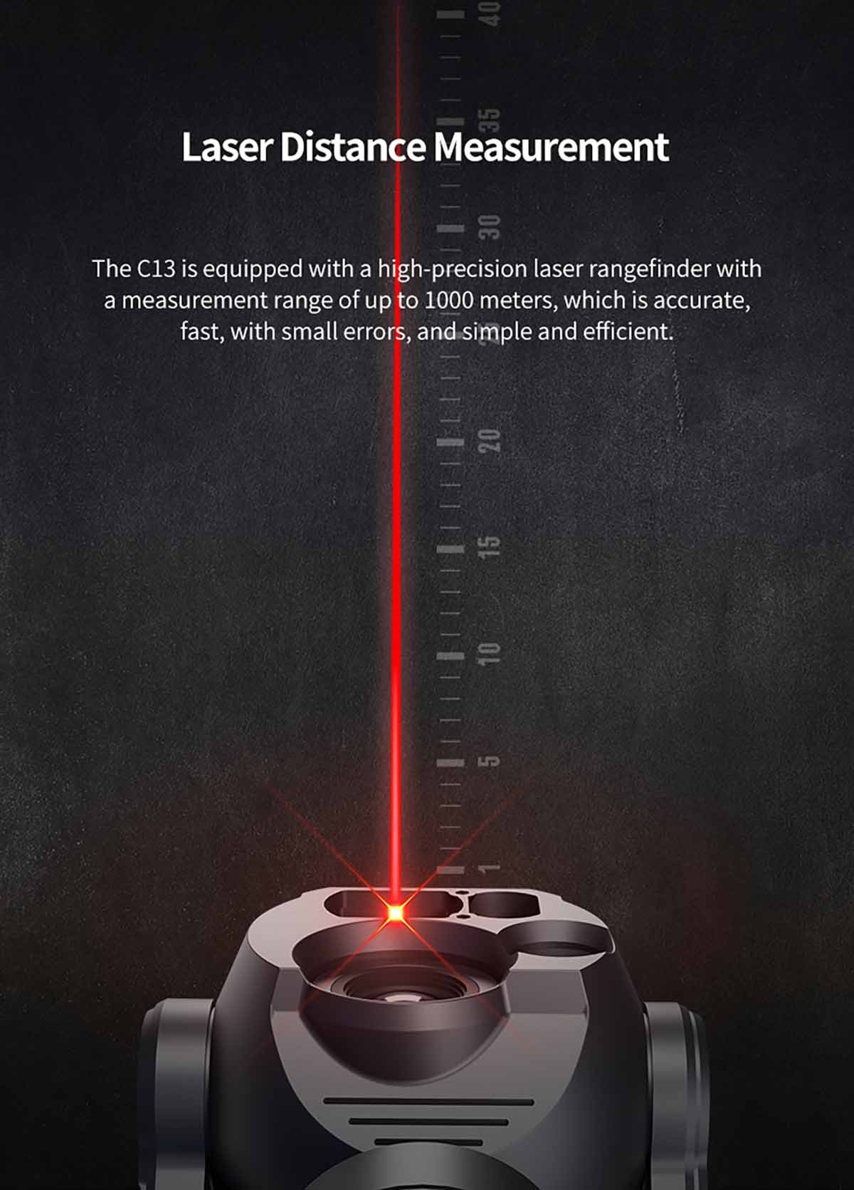 The C13 is equipped with a high-precision laser rangefinder with a measurement range of up to 1000 meters, which is accurate,fast, with small errors, and simple and efficient.