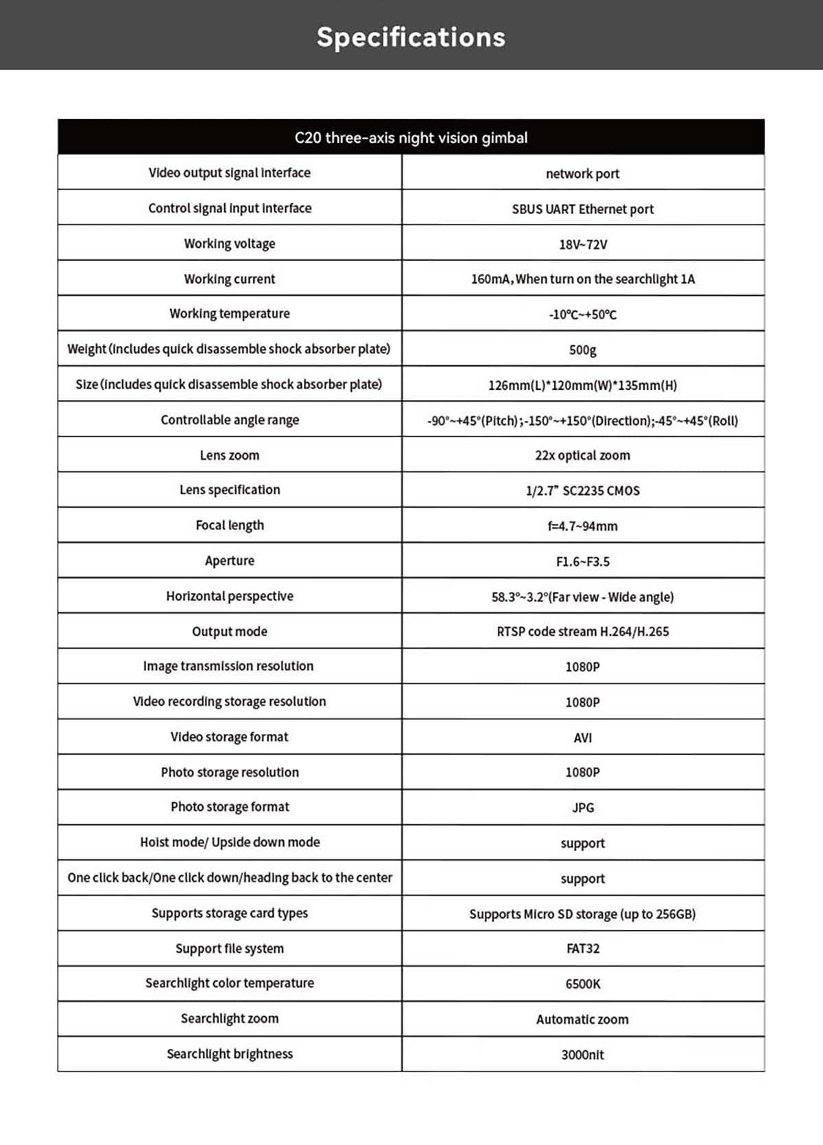 The C20 gimbal is equipped with a variable focus high brightness spotlight to enhance night time shooting ability and cope with various complex working environments.