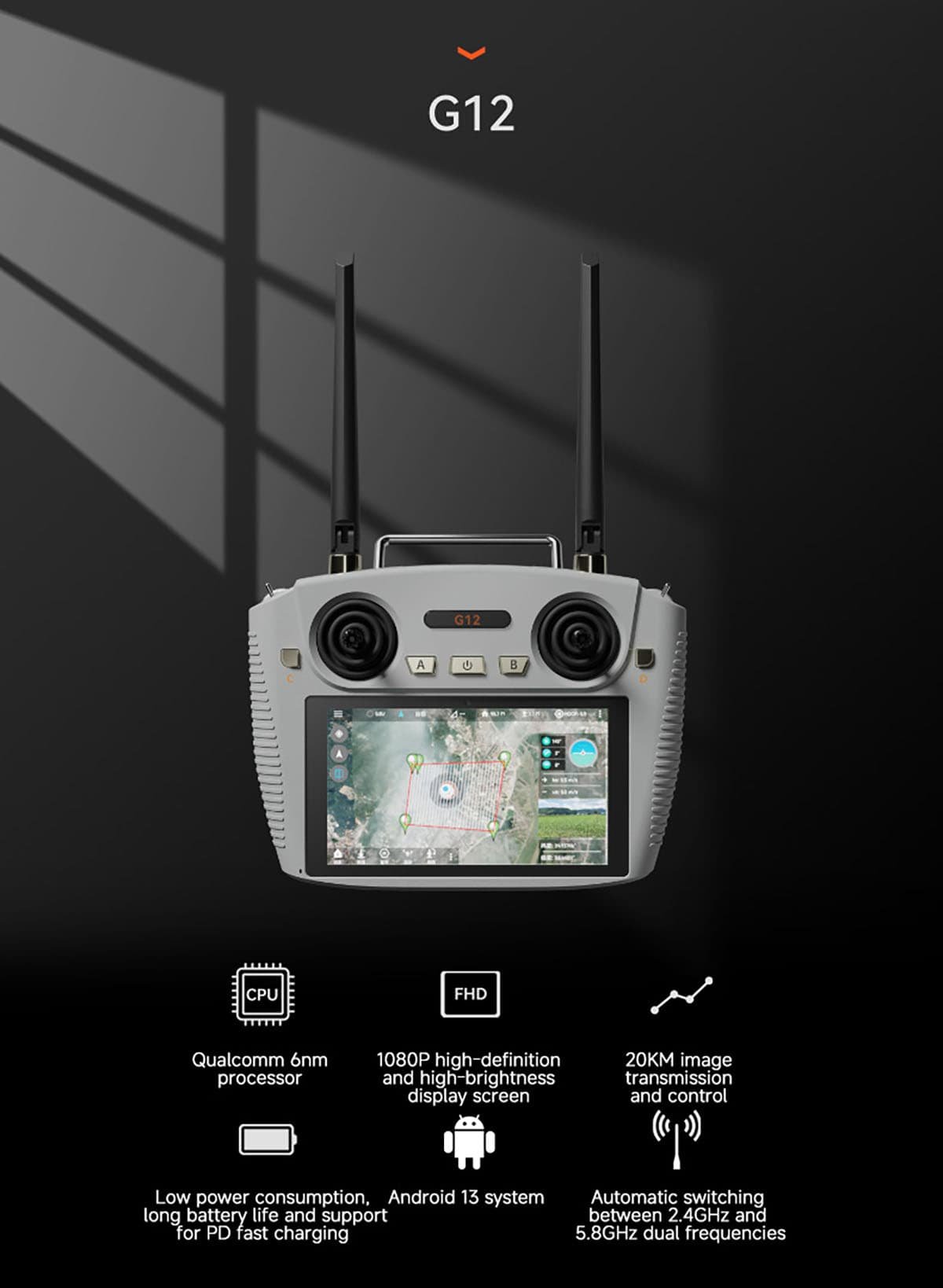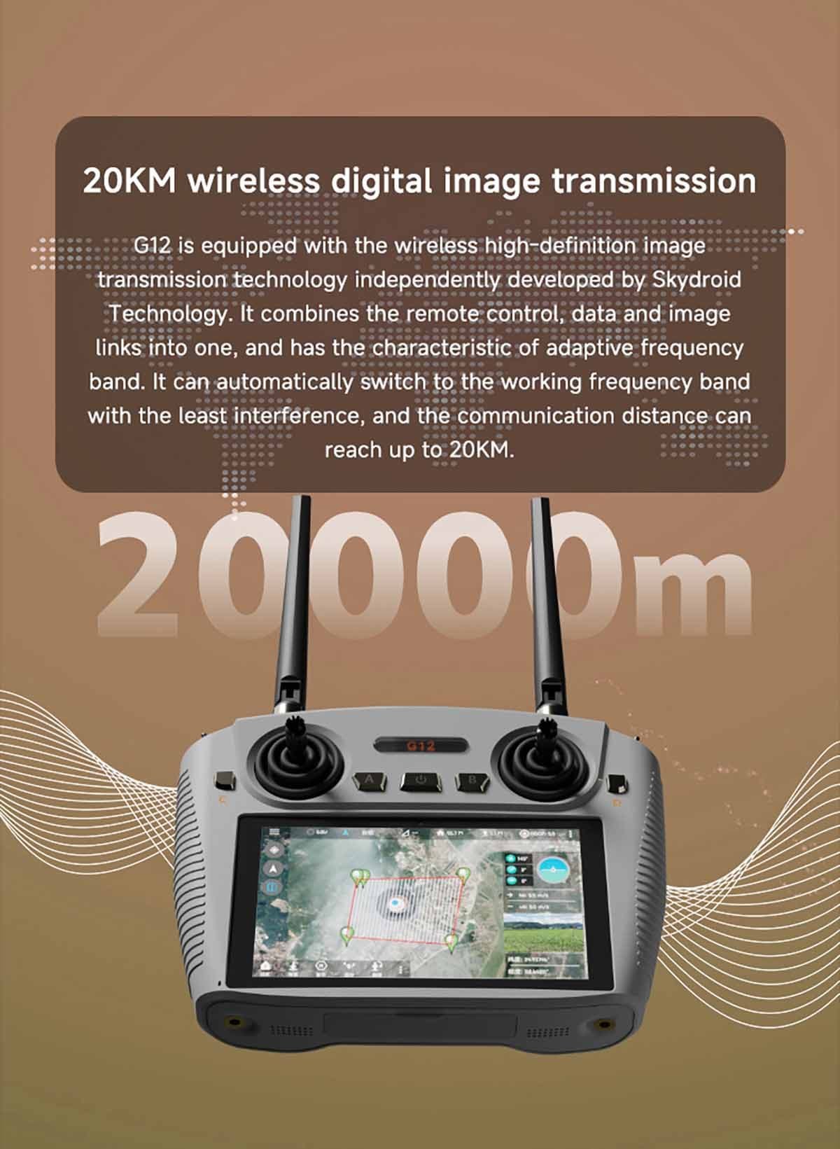 G12 is equipped with the wireless high-definition image transmission technology independently developed by Skydroid Technology. It combines the remote control, data and image links into one, and has the characteristic of adaptive frequency band. It can automatically switch to the working frequency band with the least interference, and the communication distance can