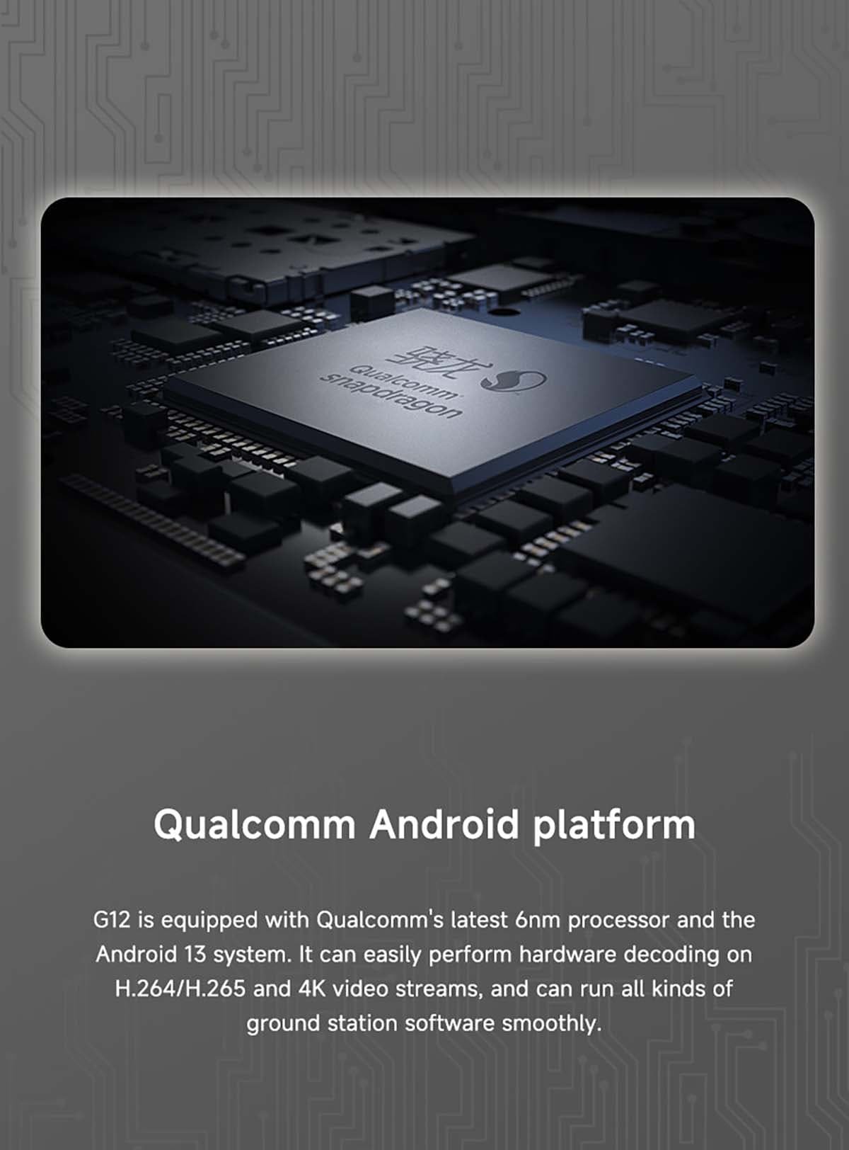 Skydroid G12 Remote Controller is equipped with Qualcomm’s latest 6nm processor and the Android 13 system, which can easily perform hardware decoding on H.264/H.265 and 4K video streams, and can run all kinds of ground station software smoothly.