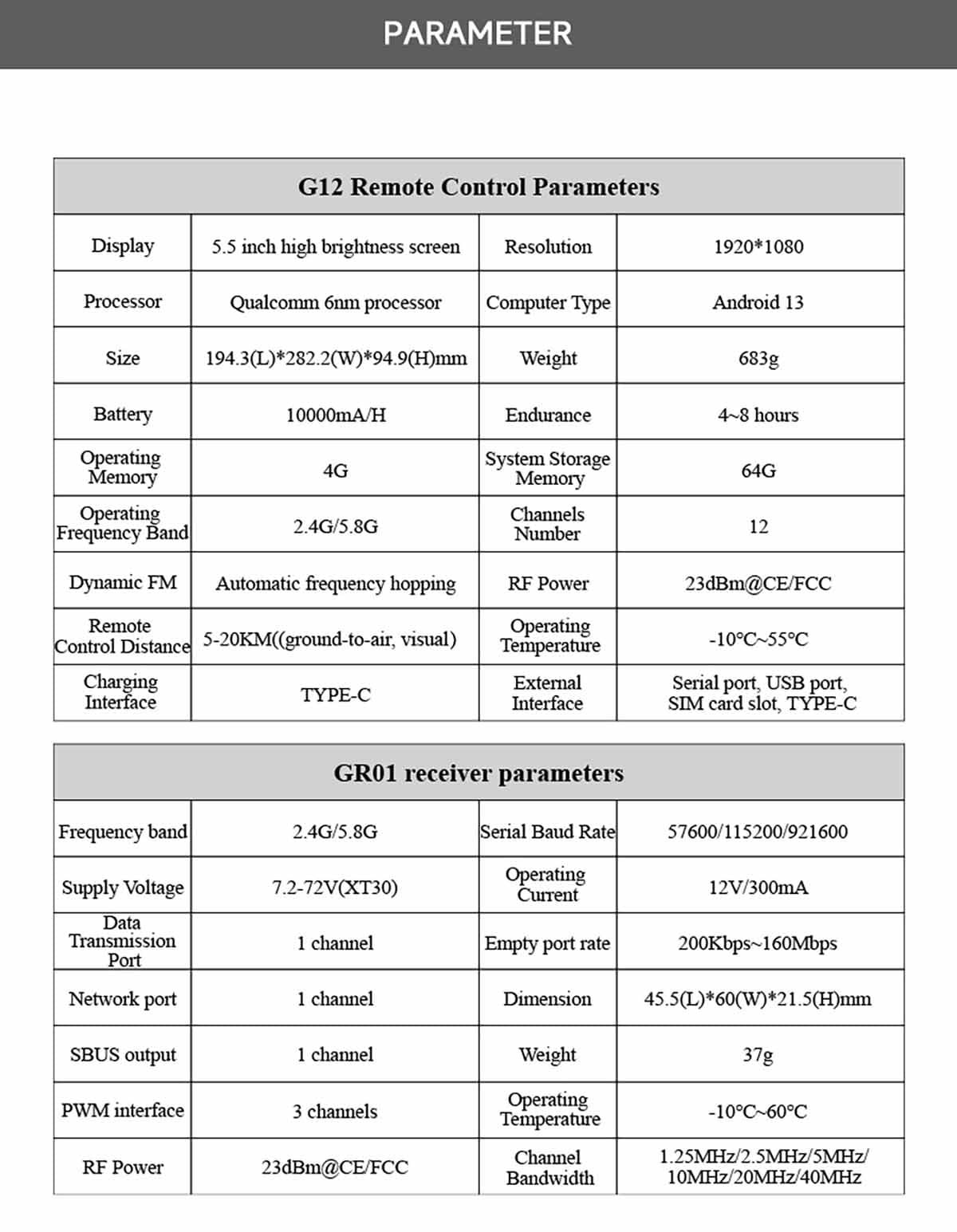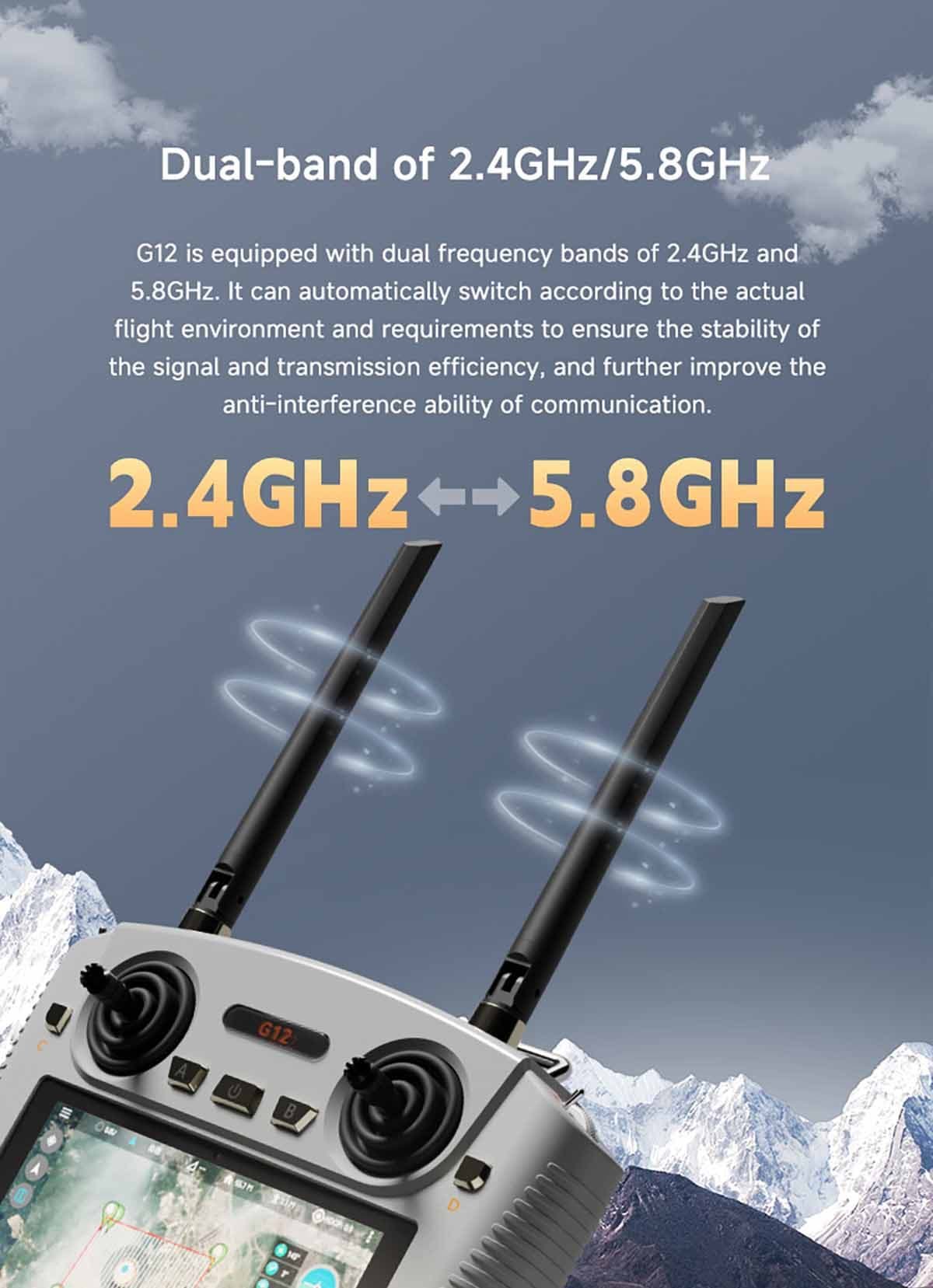 G12 is equipped with dual frequency bands of 2.4GHz and 5.8GHz. It can automatically switch according to the actual flight environment and requirements to ensure the stability of the signal and transmission efficiency, and further improve the anti-interference ability of communication.