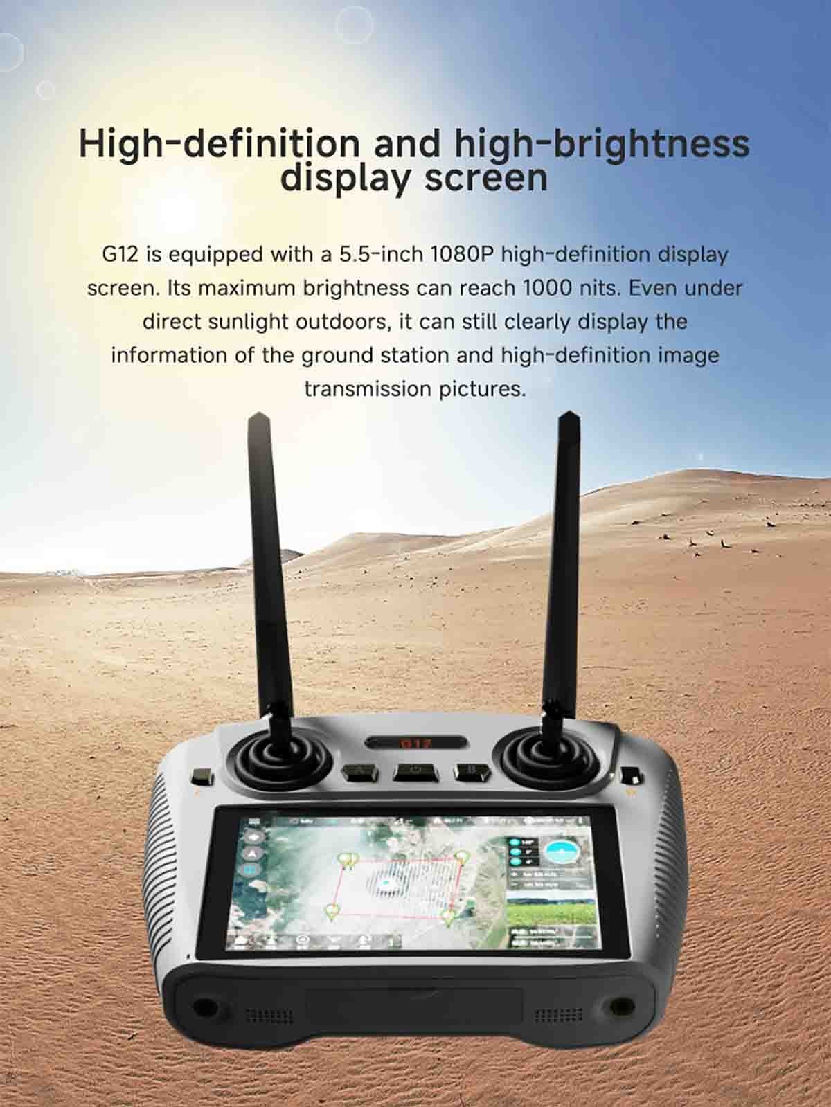 G12 is equipped with a 5.5-inch 1080P high-definition display screen. It’s maximum brightness can reach 1000 nits. Even under direct sunlight outdoors, it can still clearly display the information of the ground station and high-definition image transmission pictures.