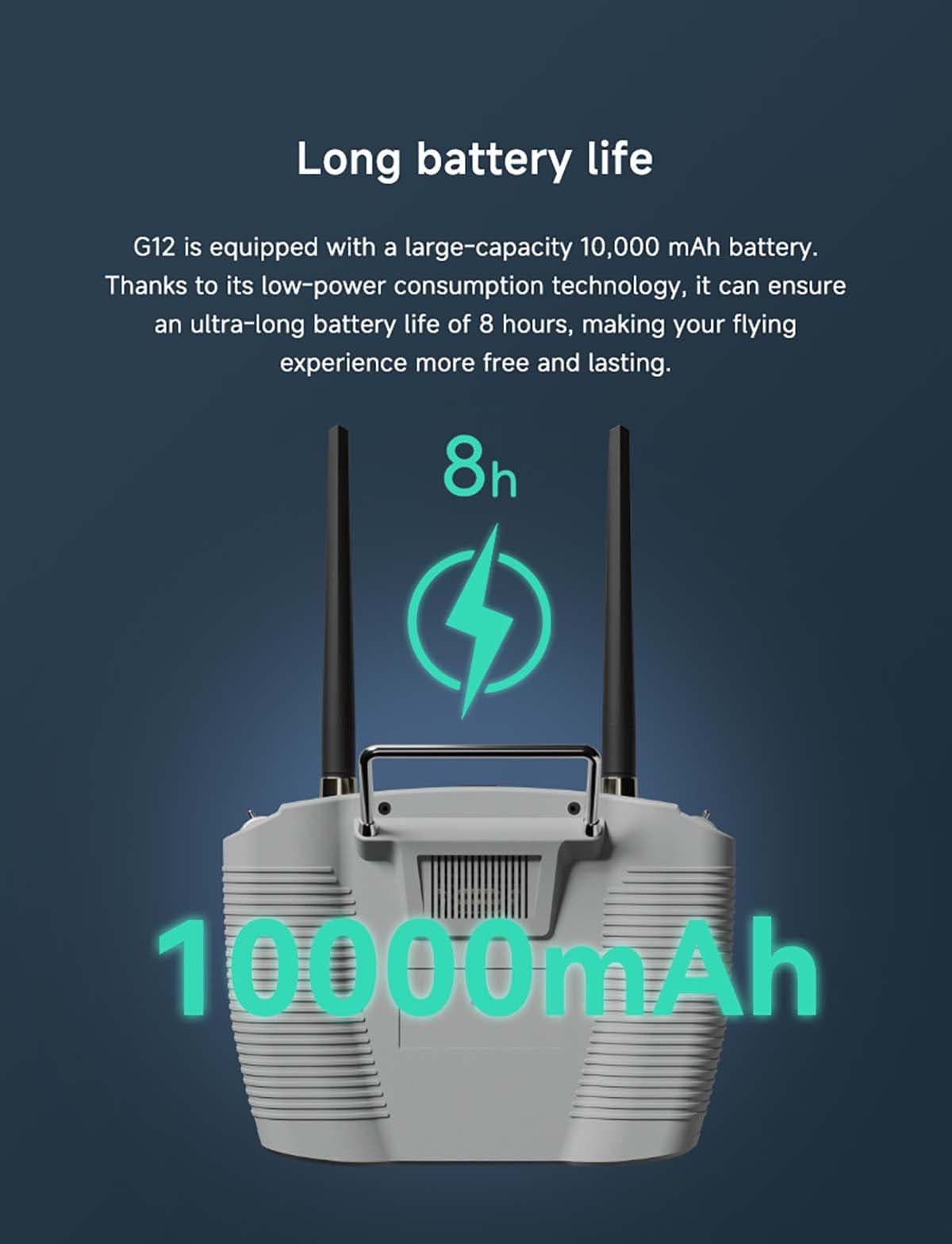 G12 is equipped with a large-capacity 10,000 mAh battery Thanks to it’s low-power consumption technology, it can ensure an ultra-long battery life of 8 hours, making your flying experience more free and lasting.