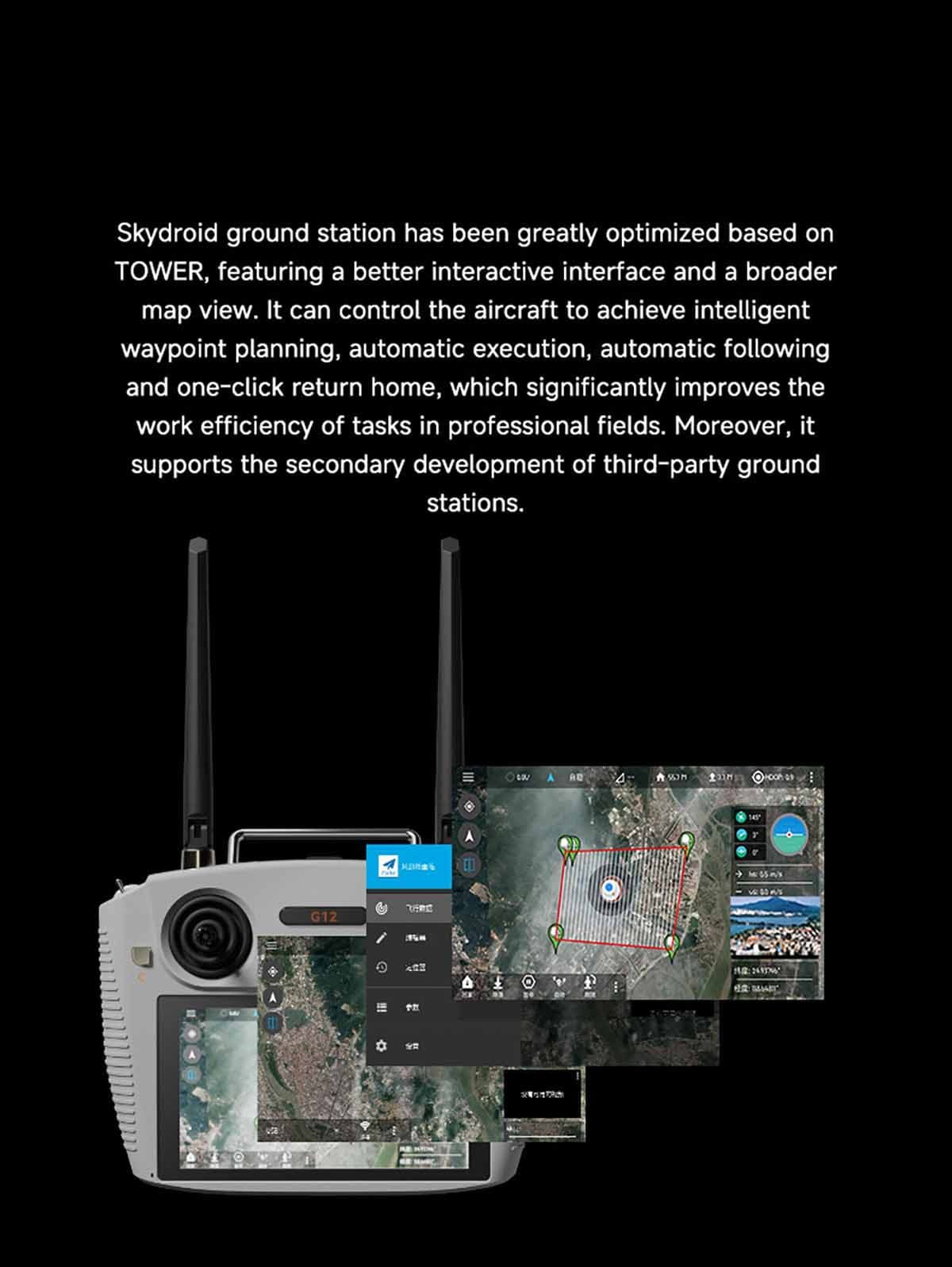 Skydroid ground station has been greatly optimized based on TOWER, featuring a better interactive interface and a broader map view. It can control the aircraft to achieve intelligent waypoint planning, automatic execution, automatic following and one-click return home, which significantly improves the work efficiency of tasks in professional fields. Moreover, it supports the secondary development of third-party ground stations.