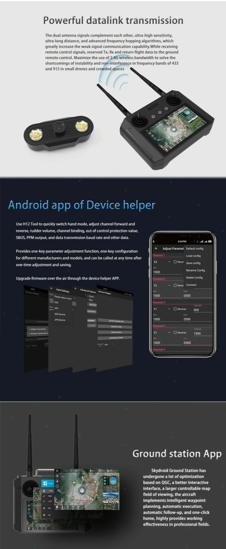 The Skydroid H12 Long Range Drone Radio System use the newest Qualcomm processor, equipped with an Android embedded system and advanced SDR technology and super protocol stack. Make the image clearer, lower the latency, long distance, stronger anti-infection, whether it is drones, robots, industrial control equipment, etc. can be applied. It can be widely used on agriculture drones, FPV security, fire protection, electric power, surveying and mapping robots, border defense, etc. The Skydroid H12 remote control is using waterproof, dust-free and drop-proof materials and structure, ensures not only feels good, but also durable!