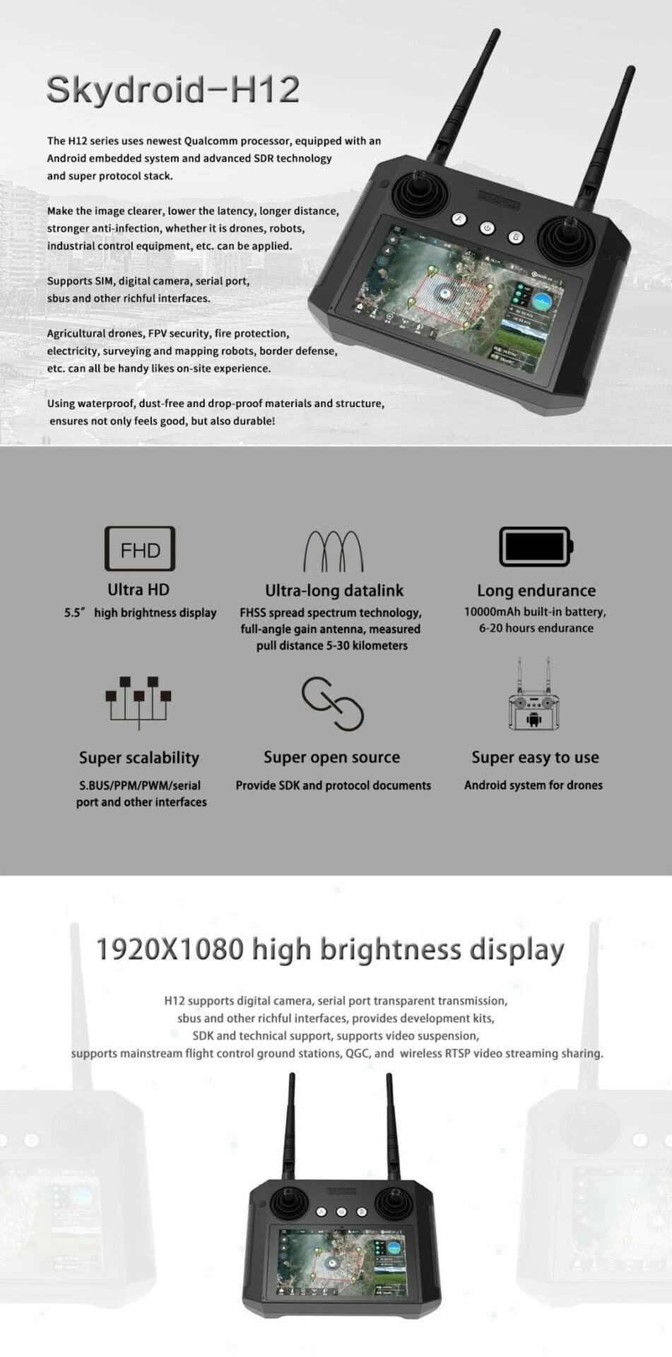 The Skydroid H12 Long Range Drone Radio System use the newest Qualcomm processor, equipped with an Android embedded system and advanced SDR technology and super protocol stack. Make the image clearer, lower the latency, long distance, stronger anti-infection, whether it is drones, robots, industrial control equipment, etc. can be applied. It can be widely used on agriculture drones, FPV security, fire protection, electric power, surveying and mapping robots, border defense, etc. The Skydroid H12 remote control is using waterproof, dust-free and drop-proof materials and structure, ensures not only feels good, but also durable!