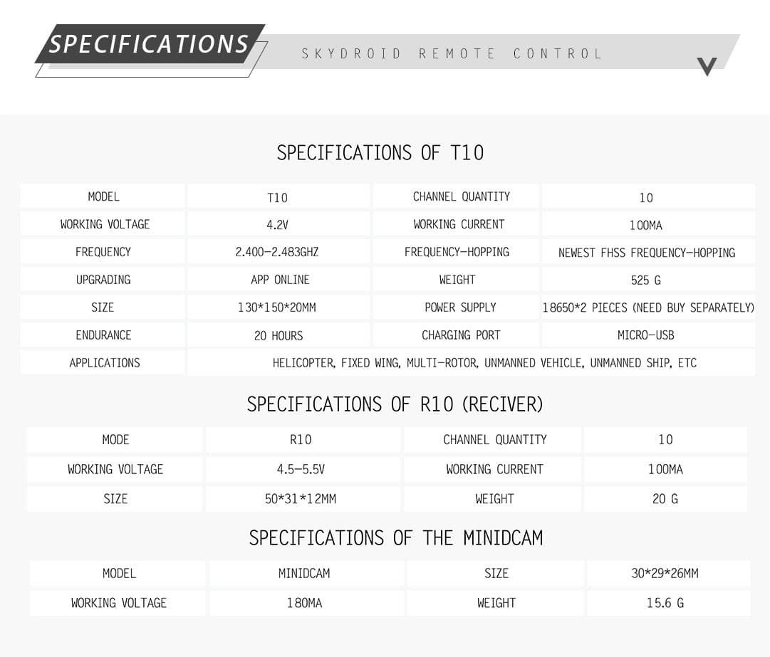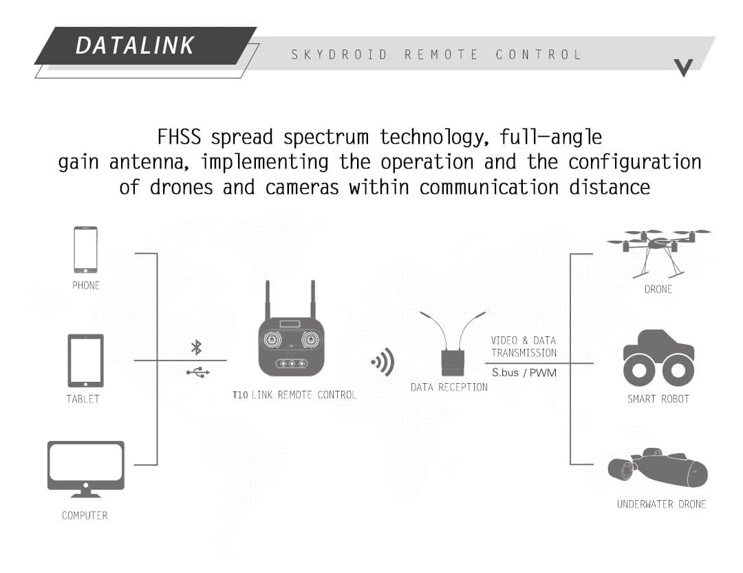 Skydroid T10 remote control integrated with digital video transmission, dual antenna plus dual RF module farthest to 10KM. Use the latest in FHSS (Frequency Hopping Spread Spectrum) technology to achieve perfect control and operation. Specially designed for UAV, Helicopter, Fixed Wing, Multi Rotor or Boat operation In video transmission (optional camera), Data Link and control of UAV.